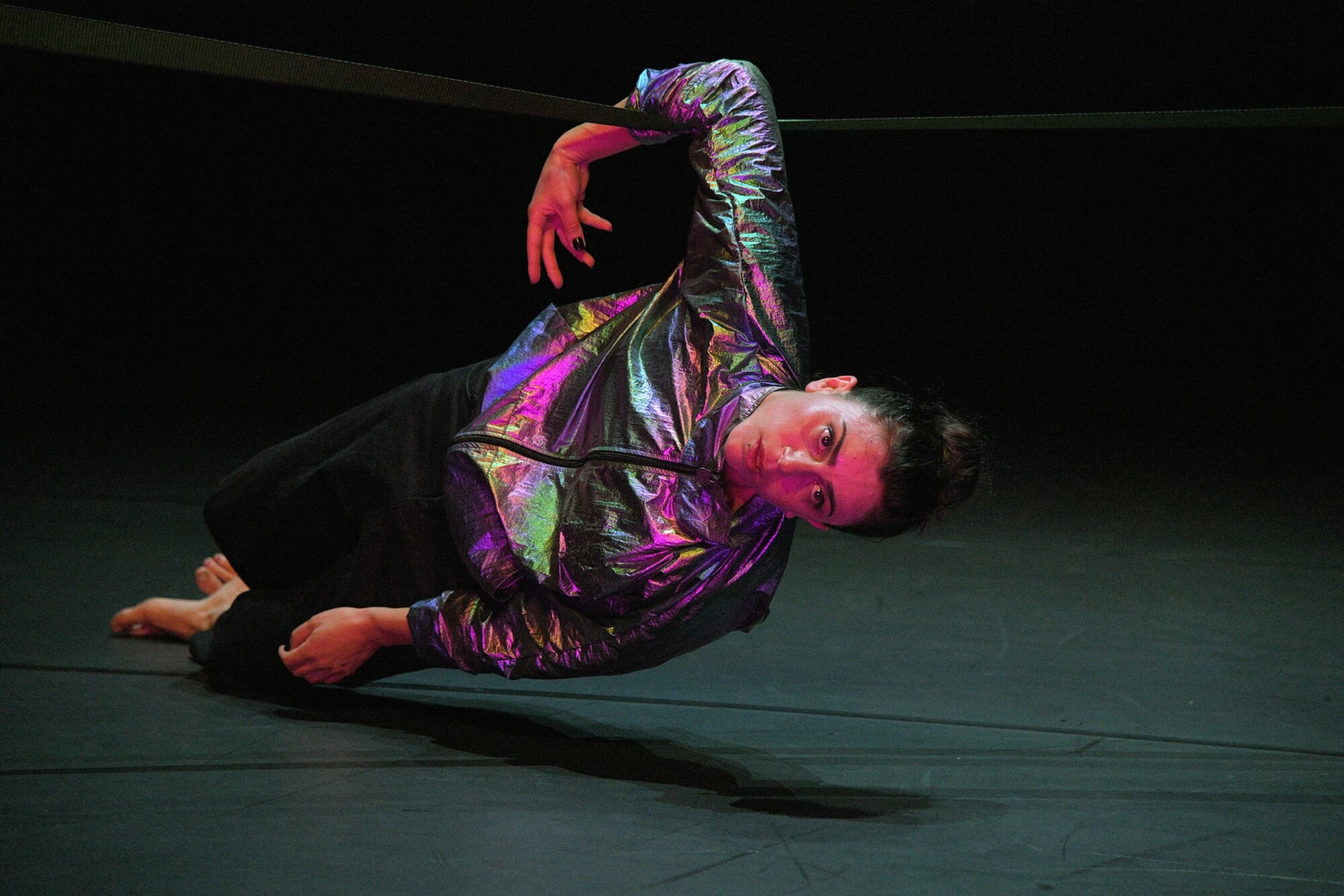 À mesure que la terreur reprend le dessus, son monde se désintègre, ses repères se brouillent et la frontière entre réel et fiction disparaît, autant dans l’espace physique que sonore. Le dialogue entre la musique live de Samar Haddad King et la voix de Samaa Wakim crée un univers dans lequel les sons qui pouvaient l’effrayer ou la réconforter s’entremêlent, incarnant un passé et un présent qui viennent obscurcir l’avenir. Cet équilibre instable, elle le matérialise par une chorégraphie réalisée sur une sangle verte tirée d’un bout à l’autre de la scène, symbole de son funambulisme existentiel.